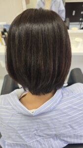 縮毛矯正は本来180℃でしますが、ダメージのある毛先などは人により150〜160℃の低温設定で施術。髪のタンパク変性を抑え、「自然にまとまる」ストレートを実現。